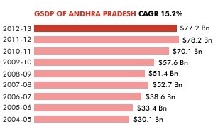 At current prices, Andhra Pradesh’s gross state domestic product (GSDP) was estimated at US$ 77.2 billion over 2012-13